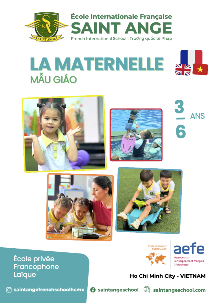 Les principes de l’école maternelle à la française appliqués à Saint Ange : - devenir autonome, s’exprimer et développer sa créativité - s’appuyer sur le jeu, la manipulation, la découverte, l’exploration - commencer à apprendre à lire, écrire, compter - découvrir les langues et les cultures : le français en langue principale, l’anglais en apprentissage progressif et valorisation du vietnamien - apprendre la sociabilisation et la vie avec les autres