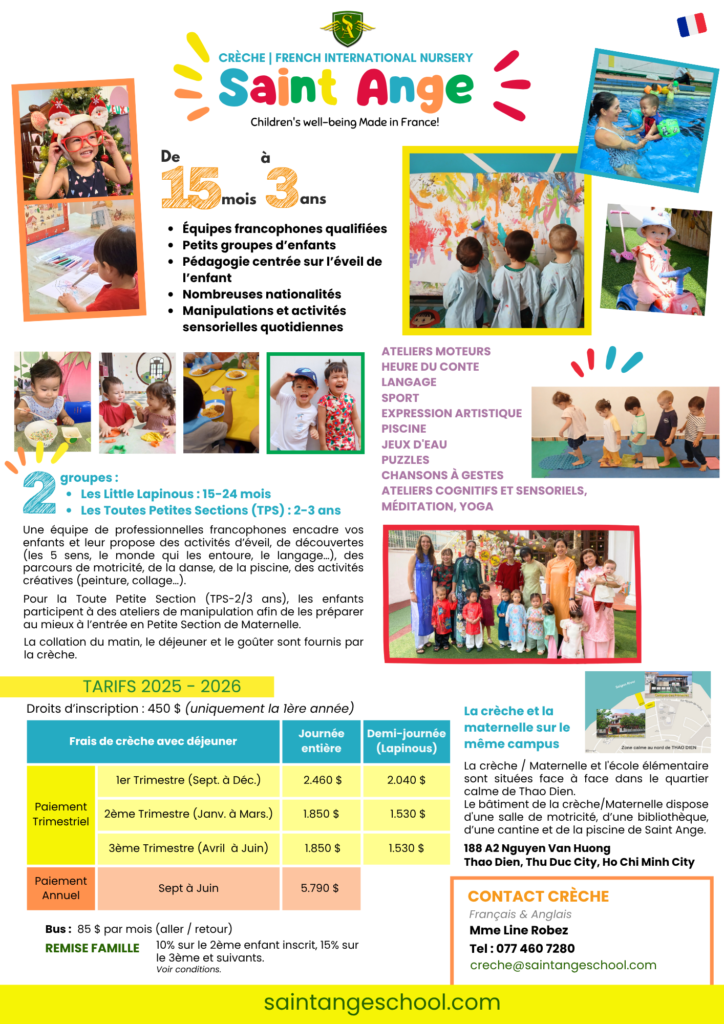 Une équipe de professionnelles francophones et vietnamophones encadre vos enfants et leur propose des activités d’éveil, de découverte (les 5 sens, le monde qui les entoure, le langage…), des parcours de motricité, de la danse, de la piscine, des activités créatives (peinture, collage…).