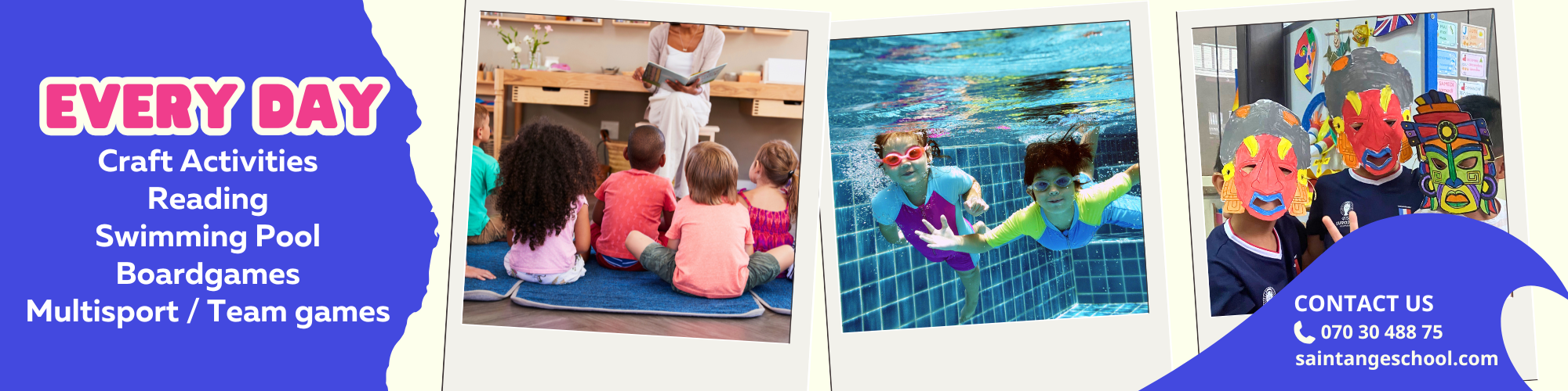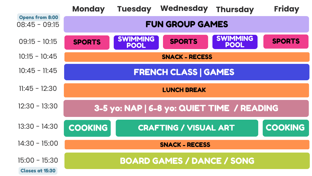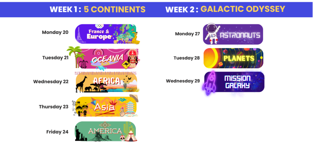 Mỗi tuần, một chủ đề liên quan đến đại dương, 5 châu lục và không gian sẽ truyền cảm hứng cho một loạt hoạt động do các nhà điều hành của chúng tôi dẫn dắt! Các bài hát, các điệu nhảy, các đồ thủ công sáng tạo, nấu ăn hoặc thực nghiệm, thể thao và đôi khi là các trò chơi sẽ được tổ chức phù hợp với chủ đề đã chọn.