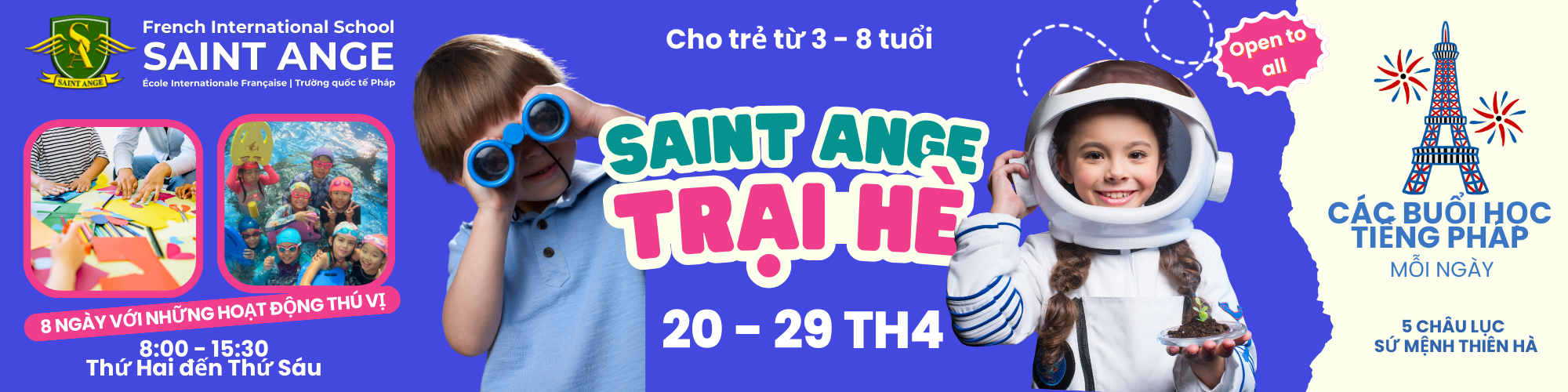 Chúng tôi tổ chức một trại hè (dành cho trẻ từ 2 đến 8 tuổi) từ Thứ Hai ngày 7 tháng 7 đến Thứ Sáu ngày 1 tháng 8. Thời gian đến từ 8:00 sáng đến 9:00 sáng, thời gian về từ 3:30 chiều.